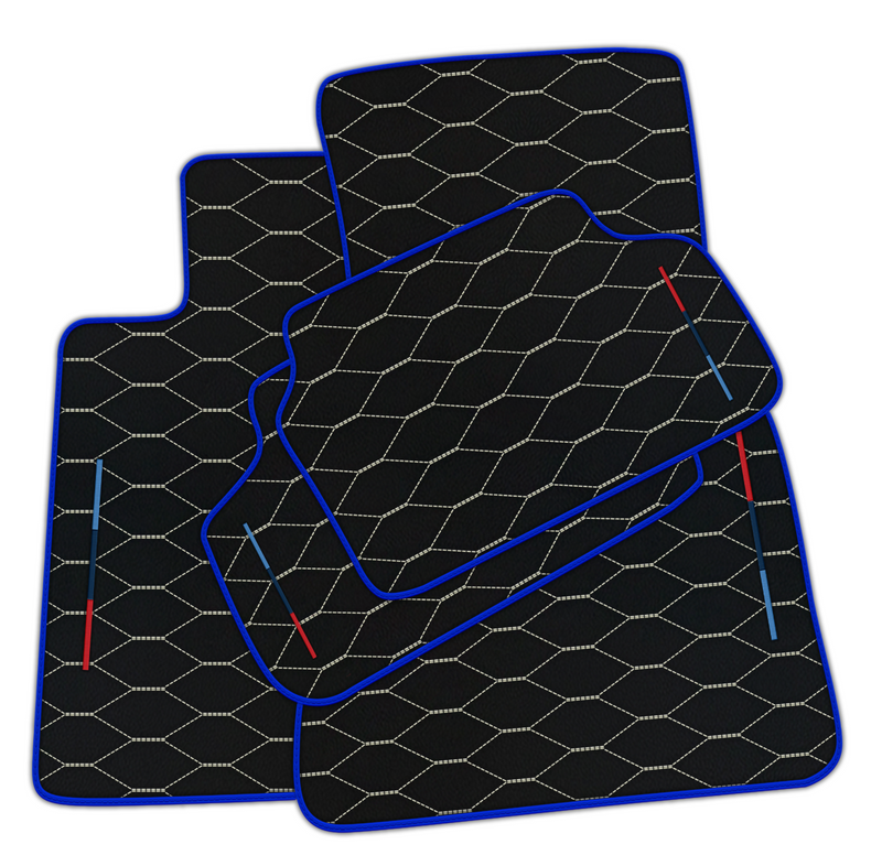 Enhance the sleek look of your BMW with these Black Leather Floor Mats. These mats feature a unique Viper Hex Pattern with white stitching and dark blue trim, adding a touch of luxury to your vehicle. Made with Tricolor M technology, these mats offer superior durability and style.