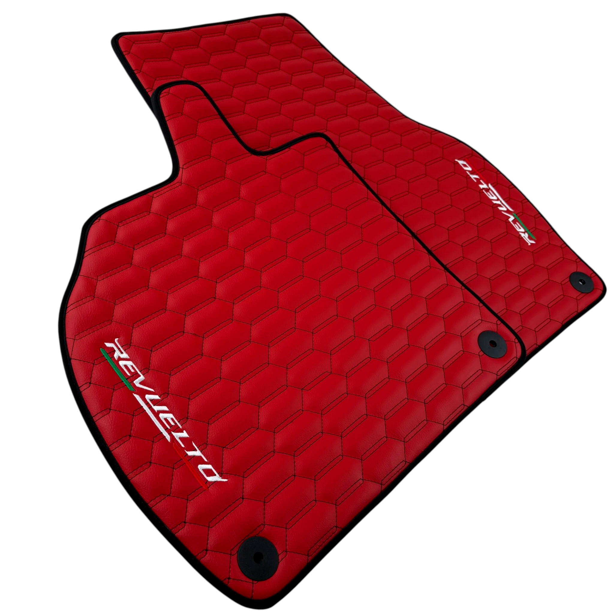 Enhance your Lamborghini Revuelto (2024-2025) interior with these red leather floor mats featuring precise hexagonal black stitching. Designed to fit perfectly, they offer durable protection while adding a stylish, sporty touch. Easy to clean and maintain, these mats help keep your vehicle’s interior pristine and comfortable.