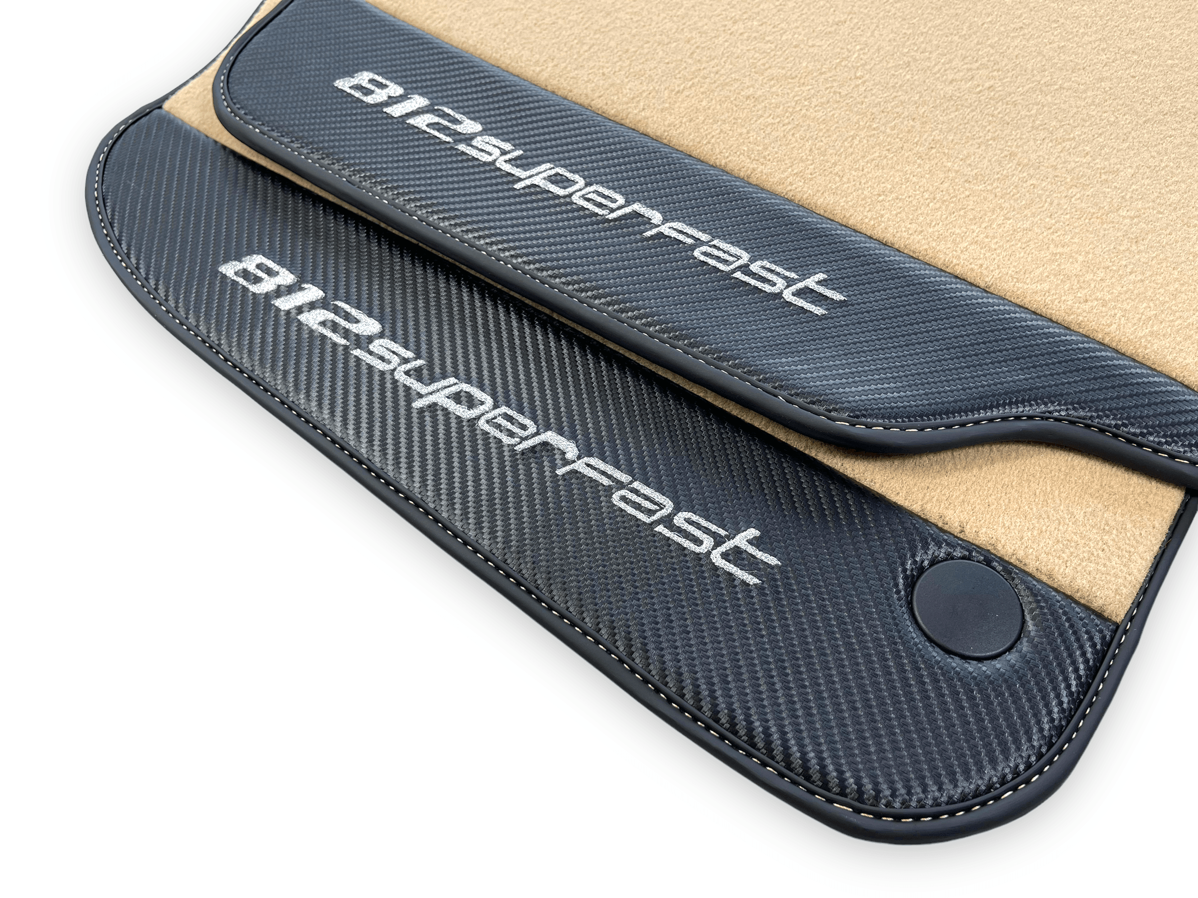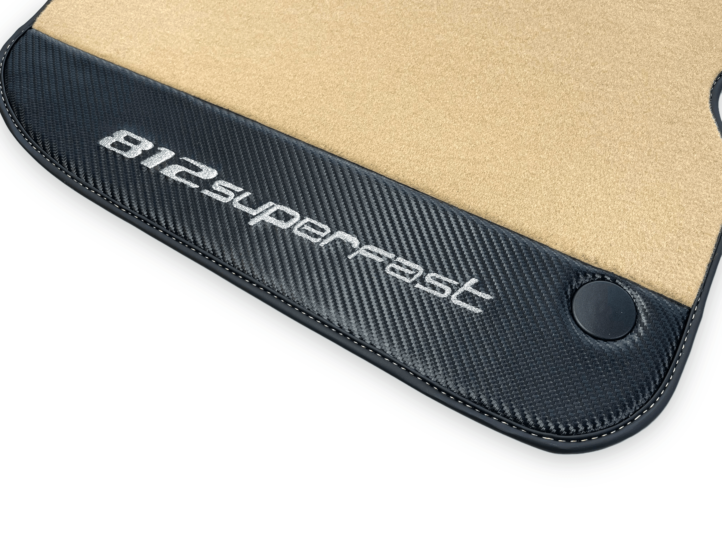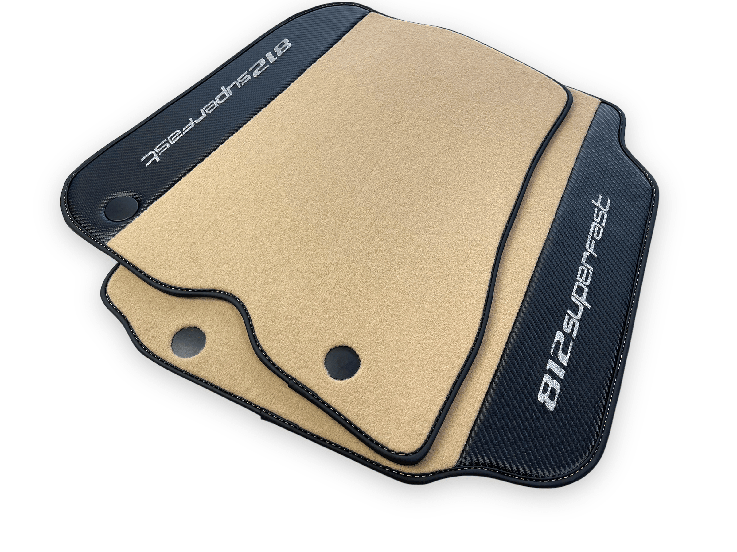 Upgrade your Ferrari 812 Superfast with these Beige Floor Mats featuring Carbon Fiber Leather. Experience a luxurious blend of style and functionality as you protect your car's interior and enhance its appearance. Expertly crafted for a perfect fit, these mats offer the ultimate in comfort and durability.