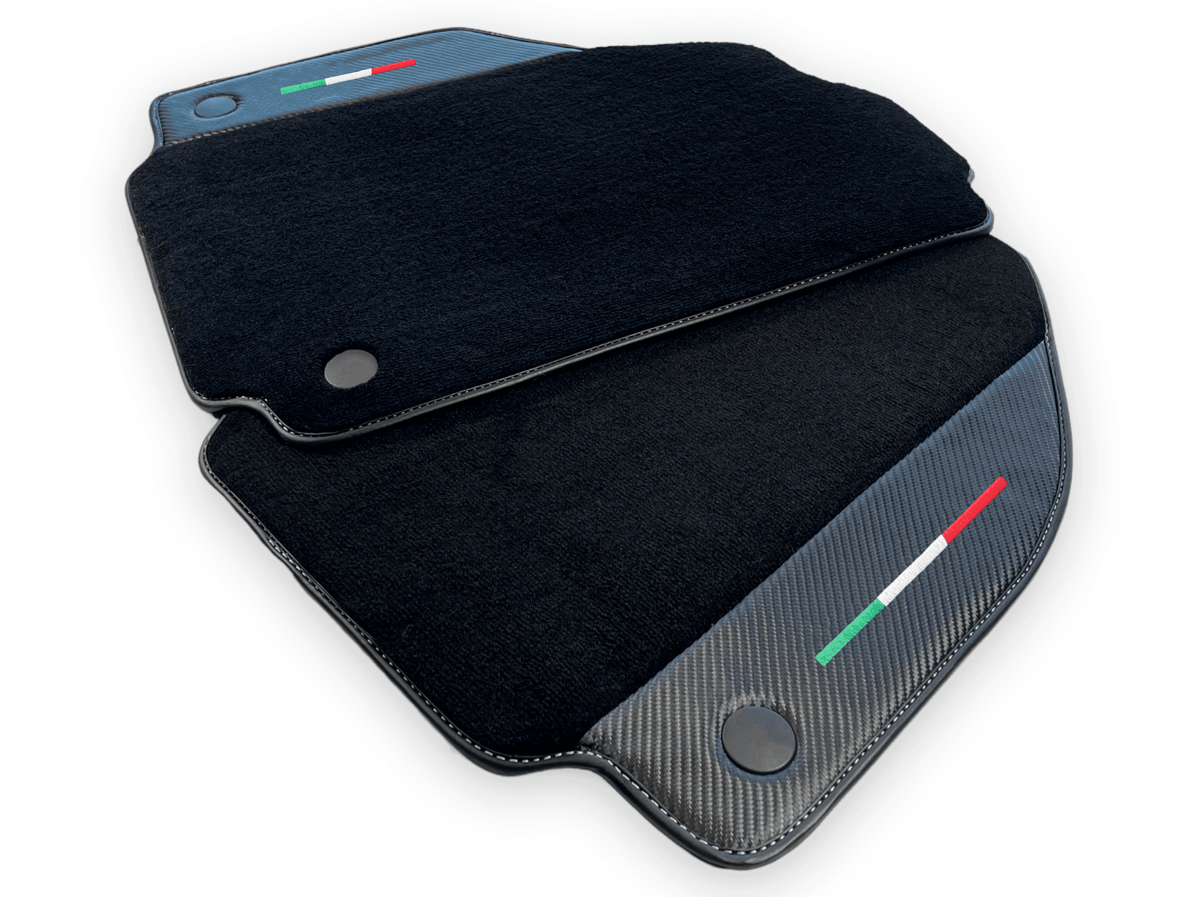 Protect your Ferrari 488 Pista Spider's interior with these sleek black floor mats. Made with carbon fiber leather, these mats provide a durable and stylish addition to your vehicle. Keep your car looking pristine while driving in complete comfort.