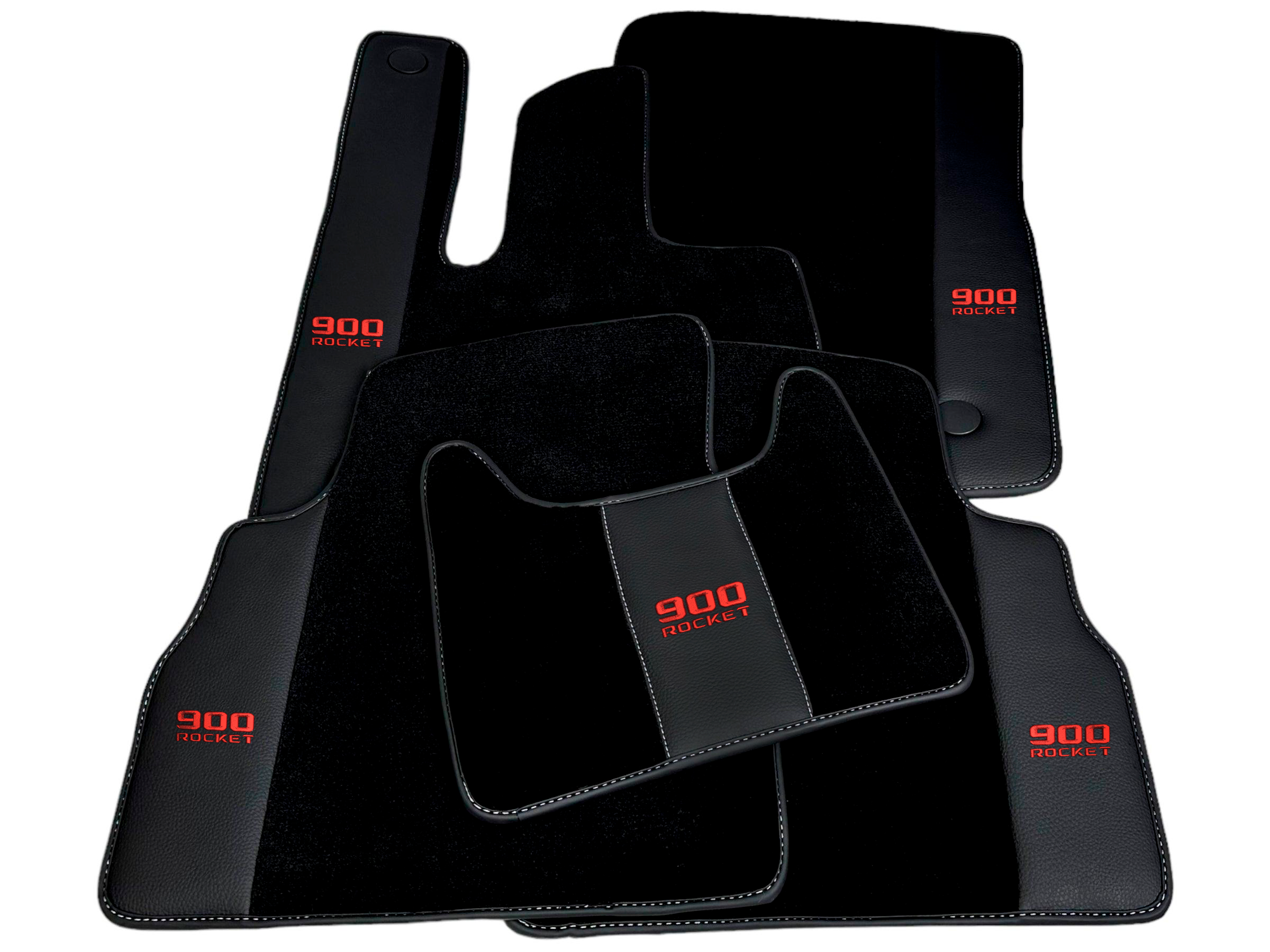 The Black Floor Mats for Mercedes-Benz G Class 2019-2022 W463 with Leather Borders are the perfect addition to your luxury vehicle. With a sleek design and red logo "900 Rocket", these mats provide both style and function. Protect your car's floors while adding a touch of elegance. Expertly crafted for a perfect fit.