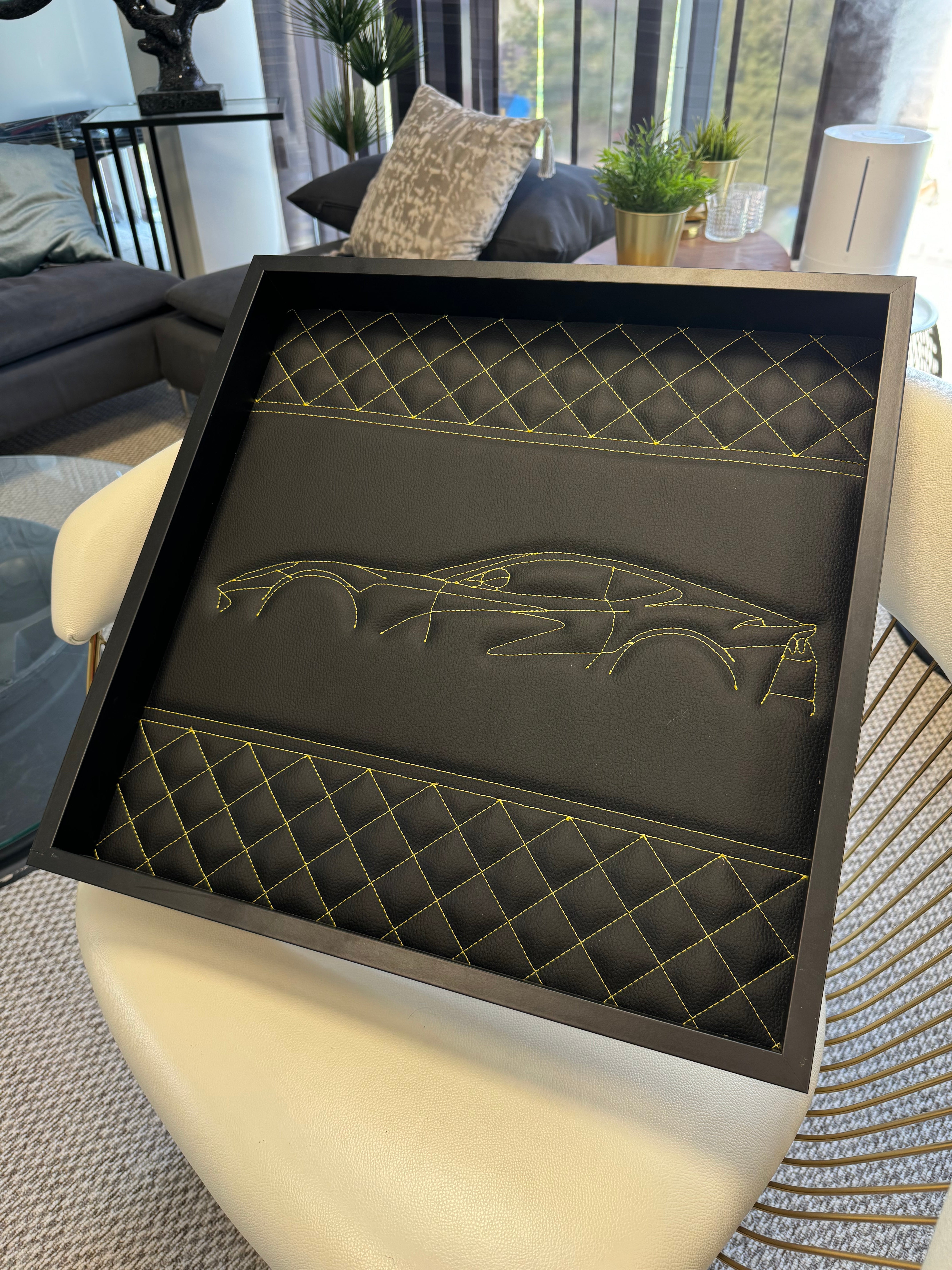 تتميز هذه الزينة الجدارية الجلدية السوداء بأنها مستوحاة من فيراري 812 سوبر فاست وتحتوي على خيوط صفراء مطرزة، مما يخلق تصميمًا فاخرًا وفريدًا. مصنوع من مواد عالية الجودة، يضيف لمسة من الأناقة لأي غرفة. قم بتحسين ديكورك مع هذه القطعة الفريدة.